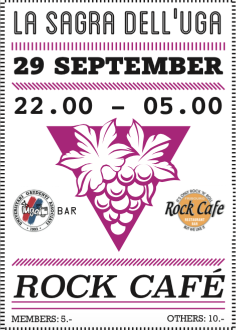 La festa si svolgerà martedì 29 settembre 2015 al Rock Café di Friborgo a partire dalle 22.00 fino alle 05.00 dove potrete godervi una serata fatta di musica e di puro divertimento. Inoltre, sarà presente il Bar UGA dove avrete l’occasione di deliziarvi con pomino, limoncino e vino.